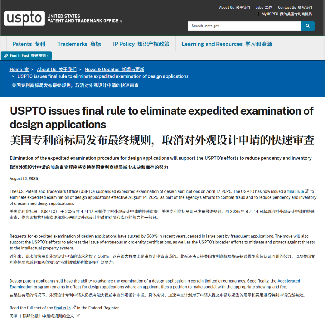 美國(guó)專(zhuān)利商標(biāo)局(USPTO)正式取消設(shè)計(jì)專(zhuān)利“加速審查(Rocket Docket)”。先是自2025年4月17日暫停受理,后于2025年8月14日通過(guò)最終規(guī)則徹底刪除該程序。今后不再可用這一通道提速設(shè)計(jì)案審查。