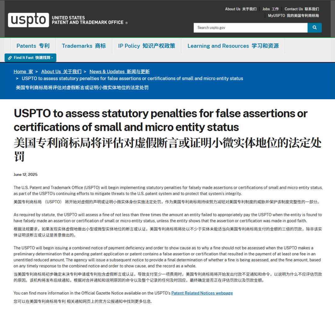 USPTO對(duì)虛假小/微實(shí)體資格的“聲明或證明”將處以不少于少繳金額三倍的法定罰金;若能證明屬善意,可獲豁免。USPTO已于2025年6月發(fā)布執(zhí)行通知,并在官方收費(fèi)表中設(shè)置相應(yīng)罰款條目(編號(hào)9301/9302)。