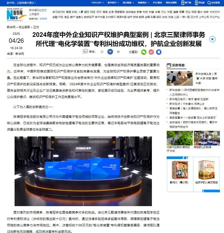 另外,新華網(wǎng)詳細報道了三聚陽光旗下三聚律師事務所報送的“珠海冠宇‘電化學裝置’專利糾紛案”,為中國高新技術(shù)企業(yè)進行專利維權(quán),以及運用知識產(chǎn)權(quán)戰(zhàn)略參與國際競爭提供了重要啟示。
